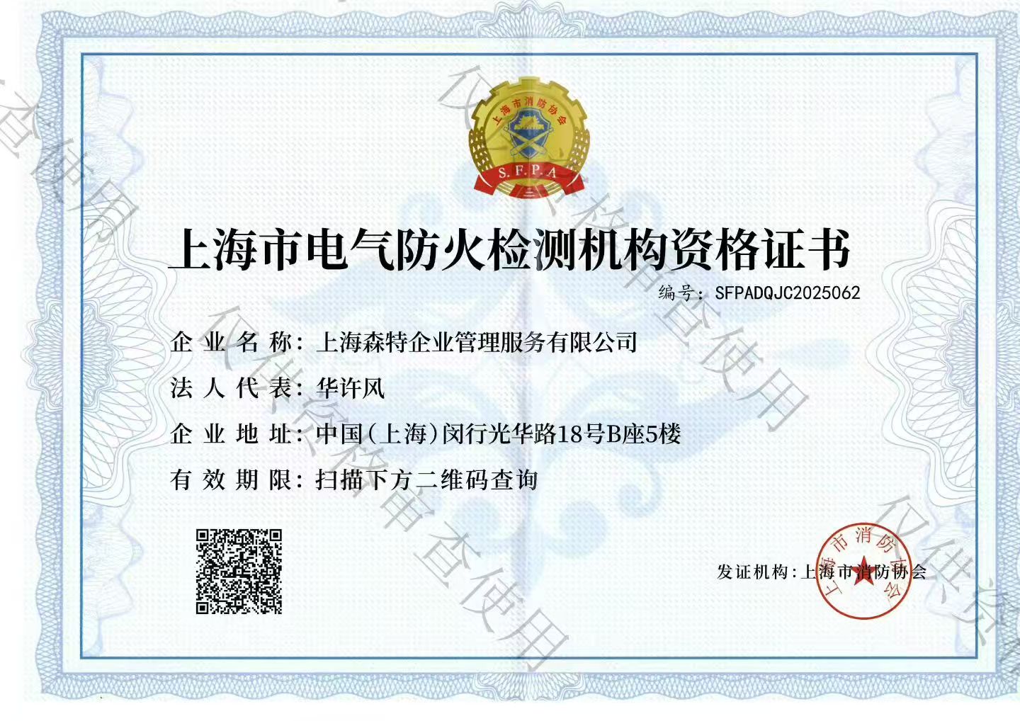 4、电气防火检测资格:森特拥有电气防火检测资格,拥有多名注安类电工,可为企业提供专业的电气安全深度震荡及电气防火检测